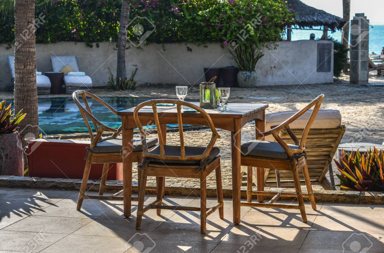The Table And Chairs Of Outdoor Restaurant Near Swimming Pool At Luxury Hotel Bentota Sri Lanka